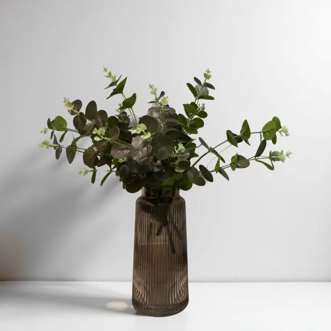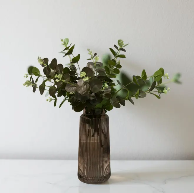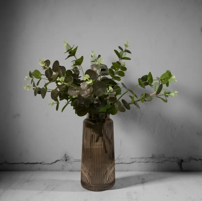 Aporta calidez y sofisticación a cualquier espacio con este jarrón de vidrio café con relieve. Su diseño vertical estriado crea un efecto visual único que resalta la textura y el color, convirtiéndolo en una pieza decorativa ideal para hogares y oficinas.